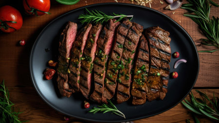 AI Generated. Sliced Grilled Flank Steak on Rustic Wooden Board with Fresh Herbs and Cherry Tomatoes