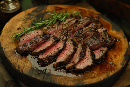 AI Generated. A perfectly cooked steak resting on a cutting board alongside a seasoning bowl and fragrant rosemary sprig