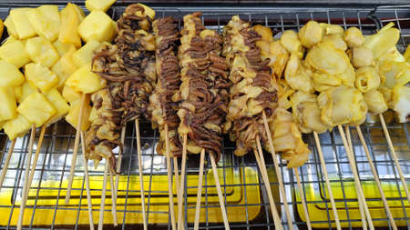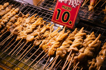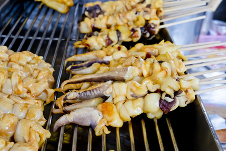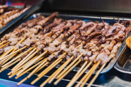 Fresh made squid skewer. Traditional thai cuisine on market.
