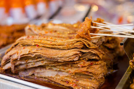 Chengdu, Sichuan, China. Beef Tripe On Skewers, close-up view. Tripe Is Type Of Edible Lining From The Stomachs Of Various Farm Animals. Tripe Is Eaten In Many Parts Of The World. Tripe Soup Is Made In Many Varieties In Eastern European Cuisine. Gastronomic Tourism. Chinese Street Food. Asian Street Food. Asian Cuisine