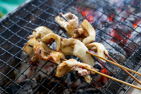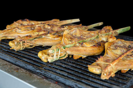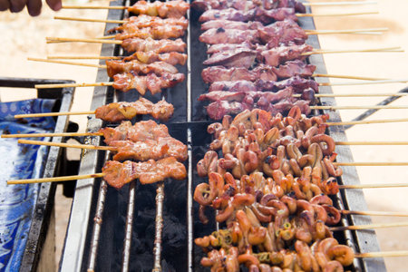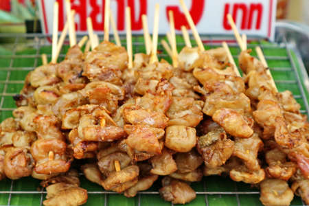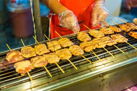 Skewered chicken and chicken liver on hot grille, thai popular street food.