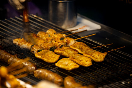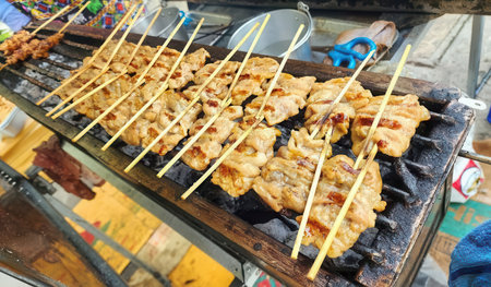cooking meat skewers on the grill in a thai food street market in bangkok