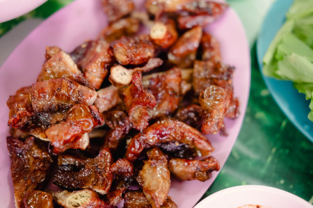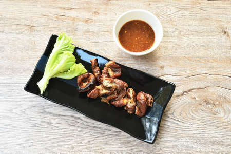 roasted pork neck and innards on plate dipping with tamarind sauce