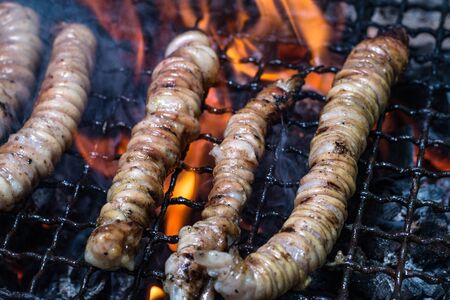 Grilled intestines, Roasted pork chitterlings. Famous street at Thailand Grilled pork intestine local street food of Thai spicy eat with sticky rice papaya salad som tum lab moo.