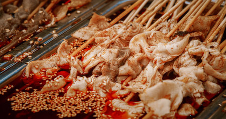 Chengdu, Sichuan, China. Beef Tripe On Skewers, close-up view. Tripe Is Type Of Edible Lining From The Stomachs Of Various Farm Animals. Tripe Is Eaten In Many Parts Of The World. Gastronomic Tourism. Chinese Street Food. Asian Street Food. Asian Cuisine