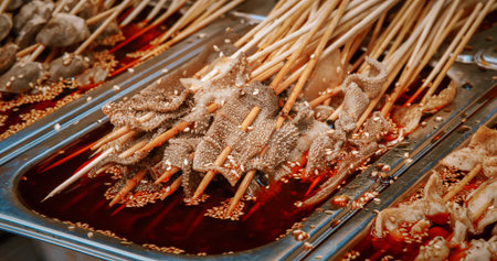 Global fusion flavors blend in market stall skewers, flavors mixing cultural elements, flavors creating unique tastes, diverse meats, colorful arrangement, perfect for international cuisine docs