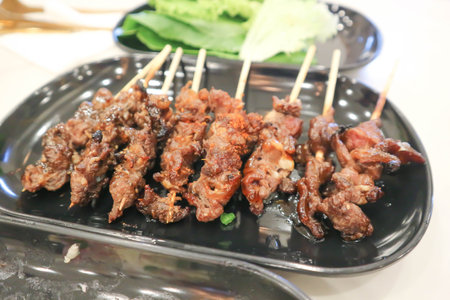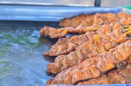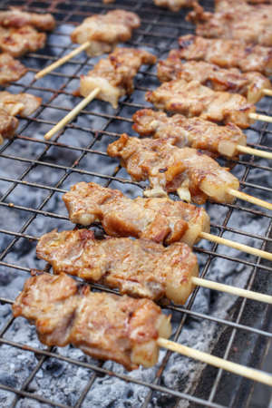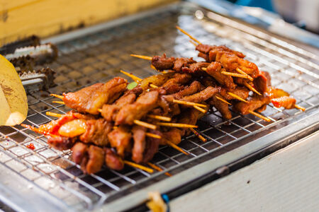 Thai-style grilled pork on a skewer, bbq food Fast In Thailand, focus selective.