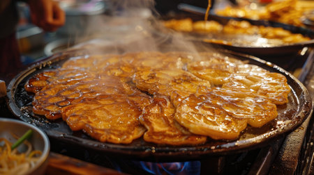 Street food on night outdoor market. Spicy, seafood, veggie, vegetable hot meal