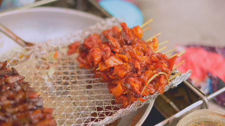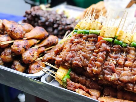Close up of Grilled pork skewers sweet spicy sauce thai street food market