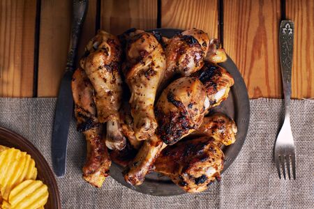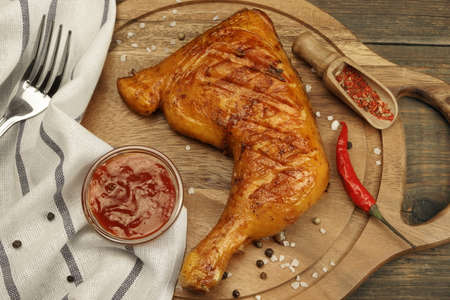 Grilled BBQ Crispy Chicken Leg Quarter On Wood Board, Top View, Closeup