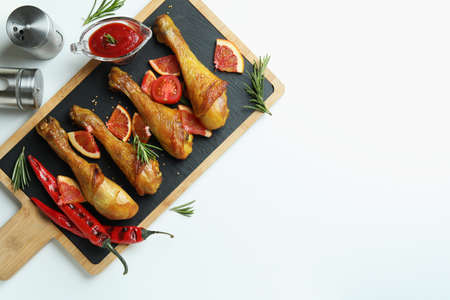 Concept of delicious eating with board of roast chicken drumsticks on white background