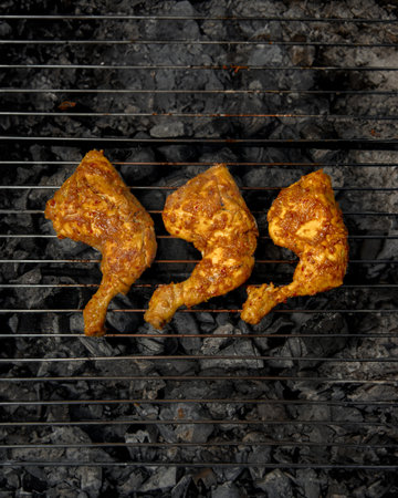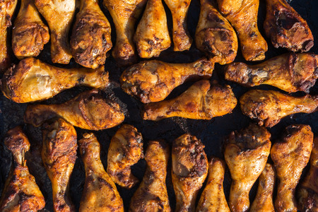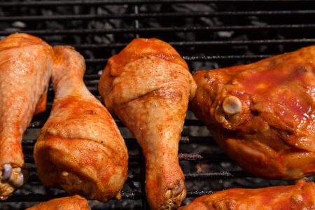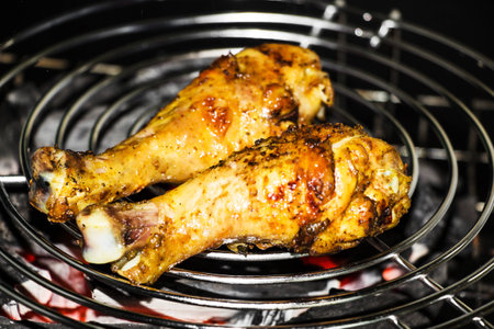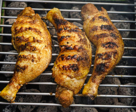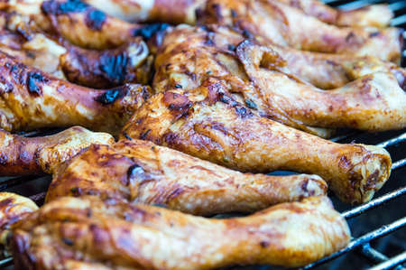 Fried chicken legs on skewers roasted over charcoal in the big grill. Closeup view from the top. Meaty chicken drumsticks with a delicious crispy crust.