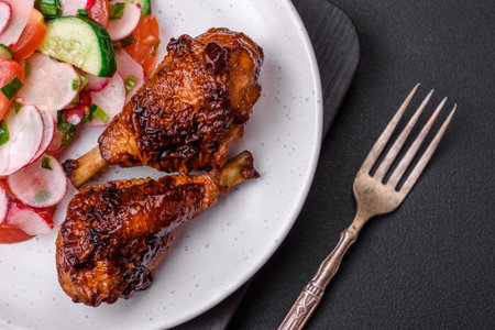 Delicious nutritious dish consisting of grilled chicken legs with a salad of tomatoes, radishes and cucumbers on a dark concrete background
