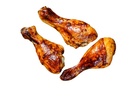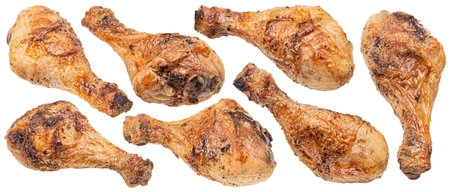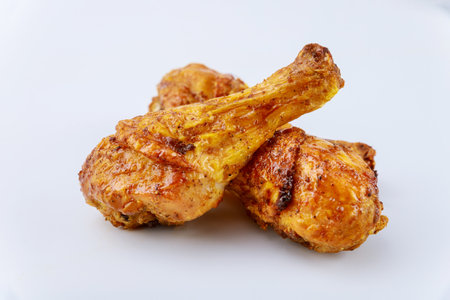 Grilled chicken legs, roasted drumsticks isolated on white background, full depth of field