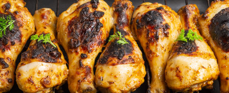 group of chicken legs being barbecued. can be used for food, protein, chicken, barbecue, grill, summer, meat themes