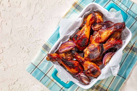 Grilled chicken drumsticks and red onion on a blue baking dish on a white background with a kitchen towel, close-up, top view, copy space
