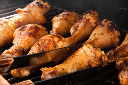 Grilling BBQ chicken drumsticks on outdoor gas grill.