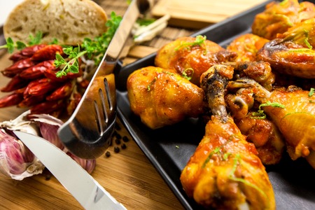 Fried golden chicken wings and legs on baking tray. Oven baked chicken pieces. Restaurant menu, dieting, cookbook recipe.