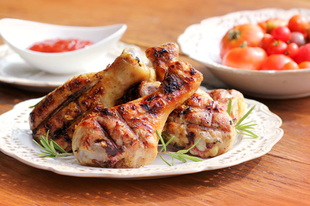 Chicken drumstick fried on the home grill, standing on a home garden on the paving stone.