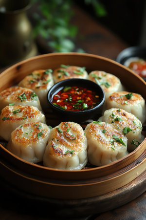 Enjoy a vibrant display of authentic steamed dumplings served in a bamboo steamer, showcasing fresh herbs and a delicious golden-brown exterior for a delightful meal.