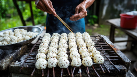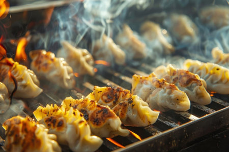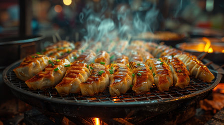 Delicious grilled dumplings sizzling and smoking on a hot barbecue grill, capturing the essence of street food perfection. Ideal for food lovers and culinary inspiration. Generated A.I.