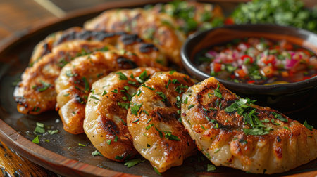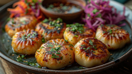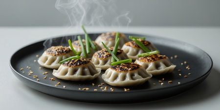 AI Generated. Grilled dumplings served on a dark plate with garnish