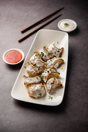 Tandoori momo, veg or non veg in red and cream sauce, served with sauce. Nepal and Tibet recipe