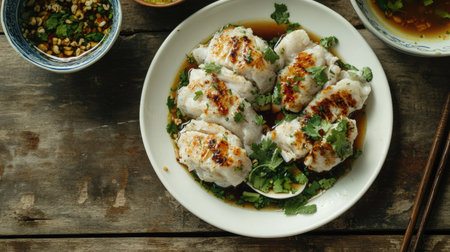 Discover a beautiful arrangement of dumplings garnished with fresh herbs, perfect for culinary inspiration or restaurant menus. Ideal for food photography.