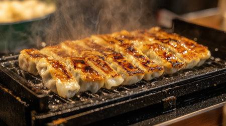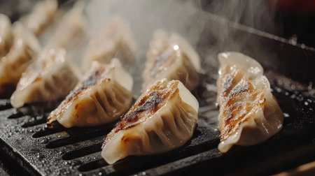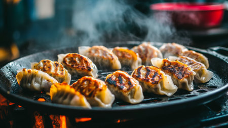 Hot grilled dumplings sizzle on a pan, releasing steam and mouthwatering aromas. Perfect for food lovers, this image captures the essence of cooking.