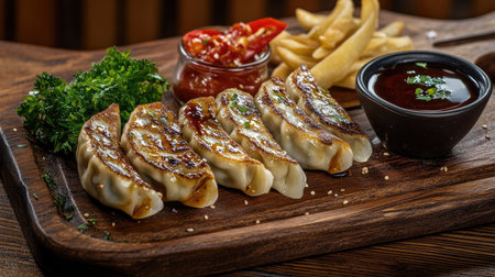 Savor the sight of perfectly cooked gyoza dumplings on a rustic wooden platter, complemented by fresh greens and a dipping sauce, ideal for a delightful dining experience.