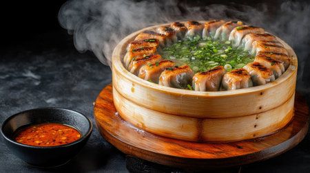A bamboo steamer filled with steaming dumplings sits invitingly on a dining table, complemented by sauces and a warm ambiance, reflecting culinary artistry.