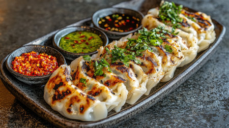 A mouthwatering plate of grilled dumplings garnished with fresh cilantro, served with an array of colorful dipping sauces on a rustic table setting.