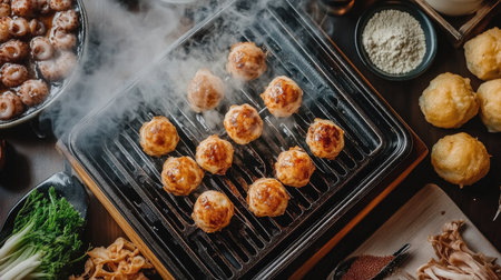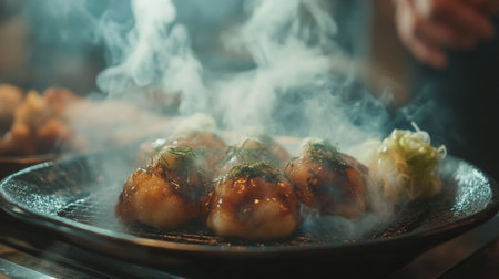 A dynamic image of takoyaki balls sizzling on a hot griddle, with a smoky background and steam rising, capturing the essence of street food preparation
