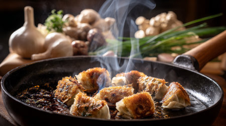 A plate of golden brown dumplings sizzles in a frying pan, releasing steam in a cozy kitchen filled with fresh garlic and mushrooms. Perfect for food lovers.