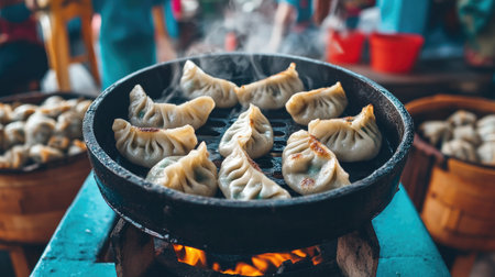 An inviting scene of steaming dumplings sizzling on a grill at a vibrant outdoor market. Experience the delicious aroma and visual charm of this street food delicacy.