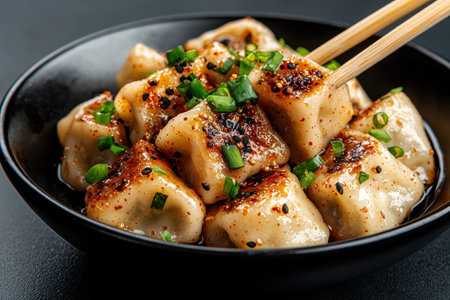 Delicious pan-fried dumplings with sesame seeds and scallions