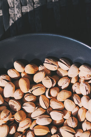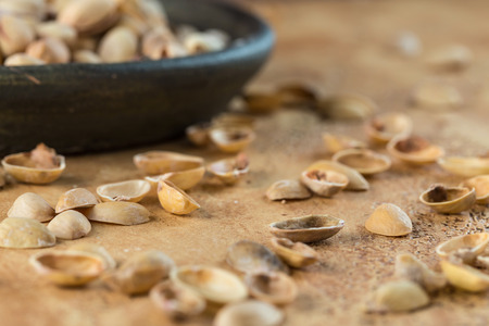 Shells of pistachio nuts in yellow stone surface. Pistachio texture.