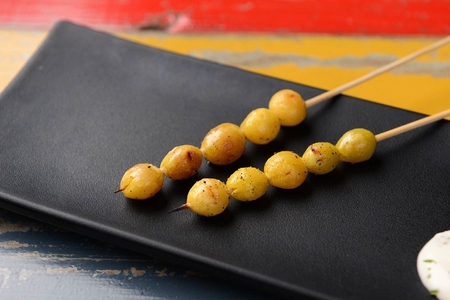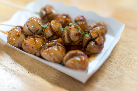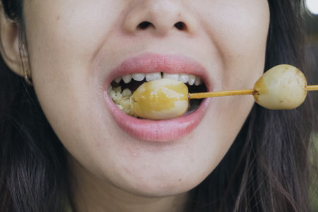 Close up portrait of Asian woman eating a skewer made from quail eggs poured by soy sauce on top.