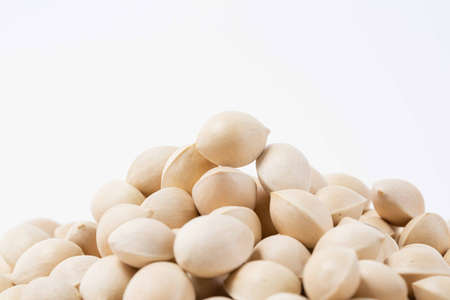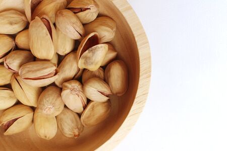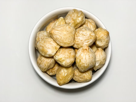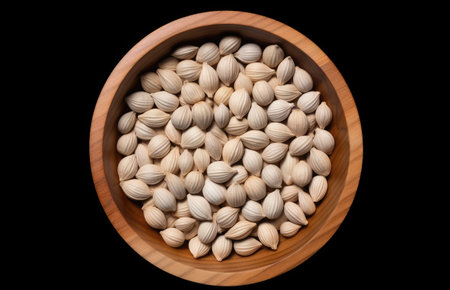 Top view of healthy Lotus seeds in wooden bowl on white background. Copy space available.