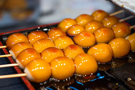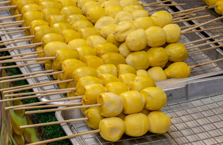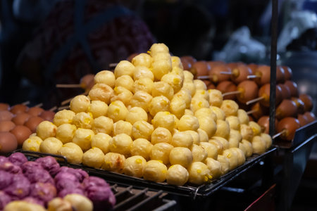 Colorful assortment of street snacks. Grilled sweet potato, taro and straw eggs, street food in Thailand.