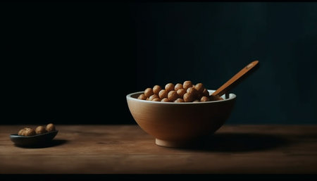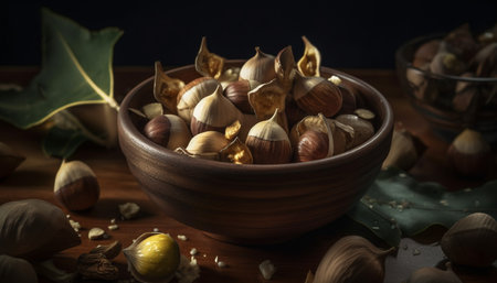 Autumn gourmet snack: hazelnut and walnut in rustic wooden bowl generated by artificial intelligence