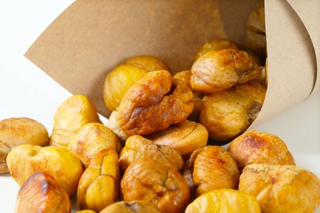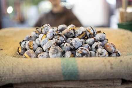 Tasty roasted chestnuts sold on the market stall in Faro, Portugal