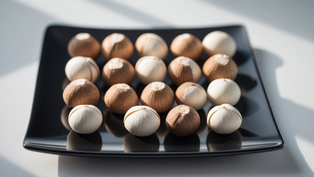 AI Generated. Hazelnuts shelled and arranged on a black plate and in a grid