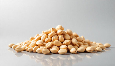Stylized stack of seeds with scattering seeds and lavender backdrop