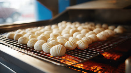 A mouthwatering view of freshly steamed dumplings arranged on a grill, showcasing the vibrant texture and inviting warmth typical of street food culture.