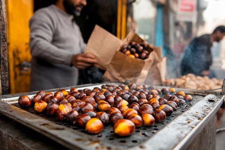 Vendors skillfully roast chestnuts over an open flame, filling the air with a warm, nutty aroma. The busy market buzzes with chatter as customers enjoy a cozy autumn atmosphere.