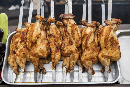 Appetizing, chicken, quail meat roasted on skewers BBQ grill. Grilled meat. Grilled meat on food festival. Food fair suggest delicious meat cooked on bbq.