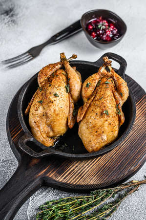 Whole roast quails in a pan. White background. Top view.
