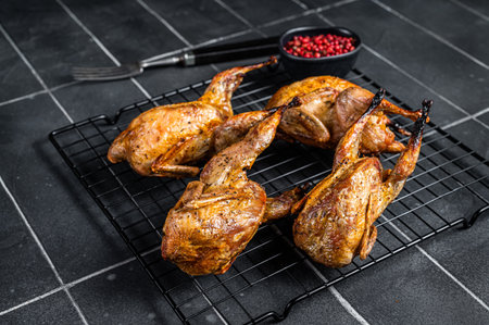 Grilled whole quails with herbs and spices. Black background. top view.