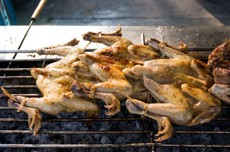 Grilling delicious poultry quails in a restaurant on grill. Roasted Partridge, quail prepared on the barbecue on sunny day. Culinary concept with delicious food.